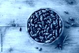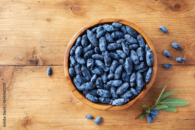 Wooden bowl with fresh honeysuckle berry on table top view. Organic superfood and healthy berry.