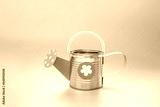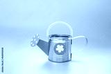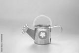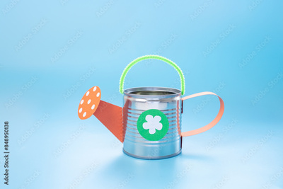 Metal watering can on table in children's papercraft picture, featuring colorful cutouts and playful elements, ideal for creative and educational themes
