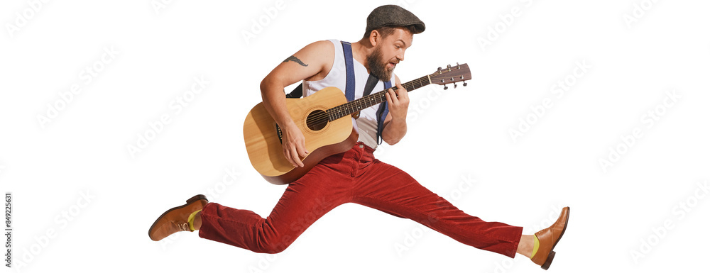 Expressive musician wearing retro style clothes playing guitar like rockstar isolated on transparent background. Vintage fashion, music, art, emotions, music festiva concept. Copy space for ad
