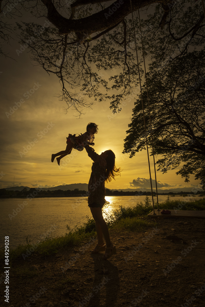 Mother and daughter playing at river side. Throwing up daughter in the air.