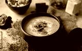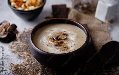 Roasted mushroom champignons soup with cream and croutons in a bowl
