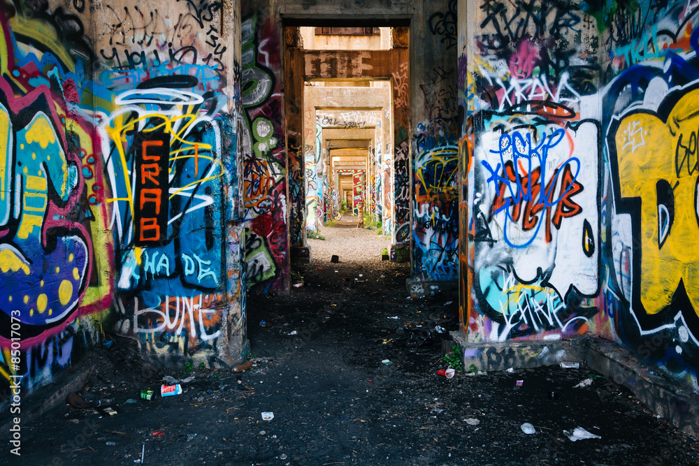 Graffiti under an abandoned pier in Philadelphia, Pennsylvania.