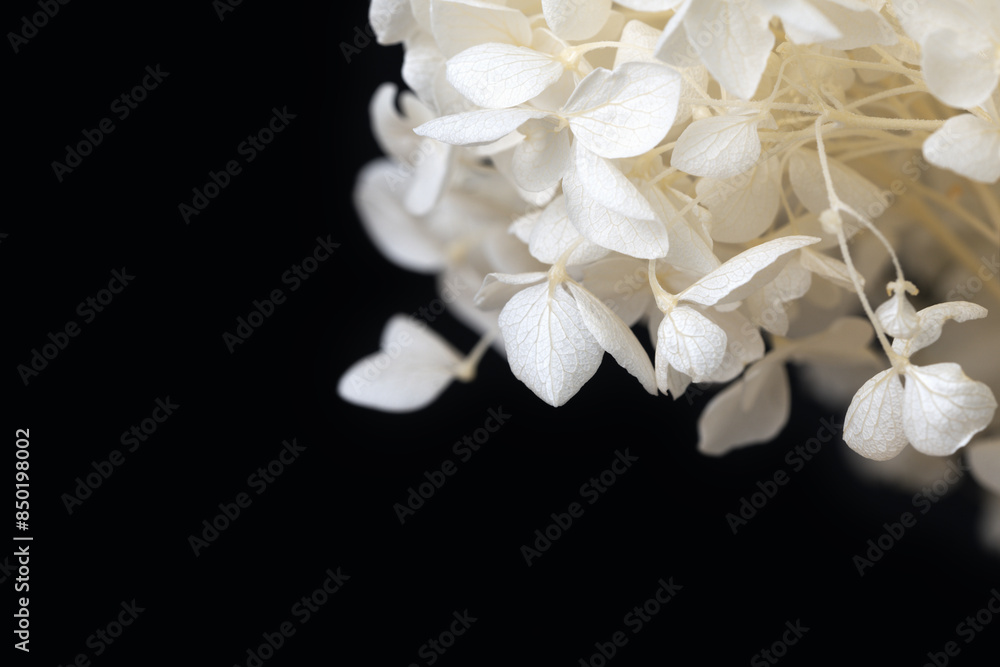 Blooming fresh hortensia white flowers gentle and romantic bouquet with place for text and black background macro