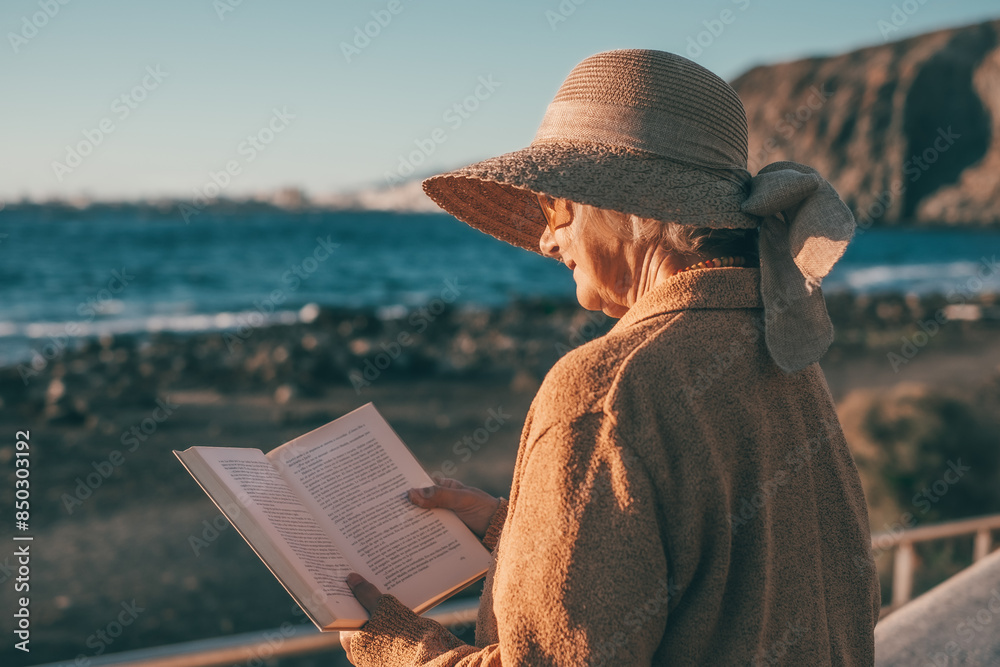 Serene retirement lifestyle. Smiling senior woman in outdoors enjoying retirement sitting face the sea reading a book