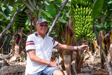 Smiling elderly man during a visit to banana plantation - carefree elderly male holds a bunch of green bananas still attached to the plant. Banana cultivation in the Canary Islands