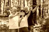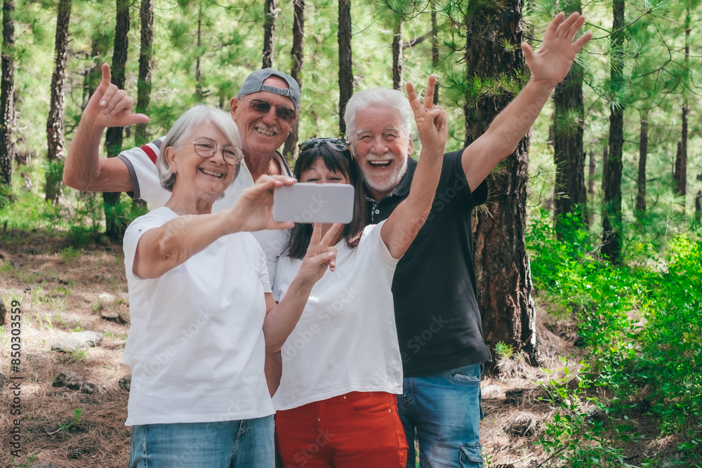 Group of joyful senior friends enjoying a trekking day in the forest, elderly caucasian couples of retirees smiling carefree take selfie with smartphone, healthy lifestyle in outdoors concept