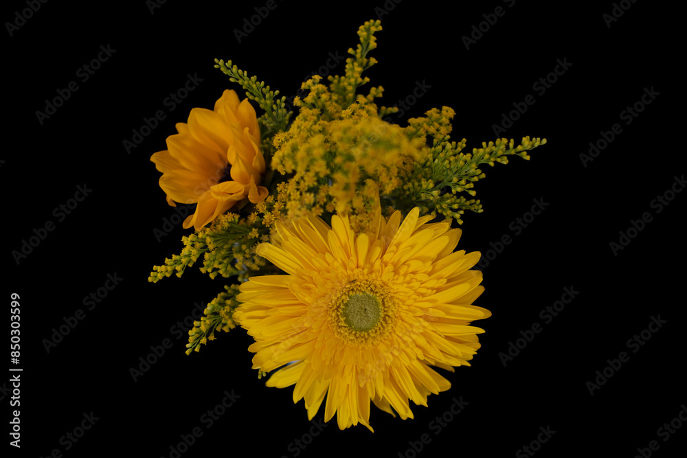 Close up image of a vibrant bright yellow gerbera daisy in small bouquet with others yellow flowers blooming