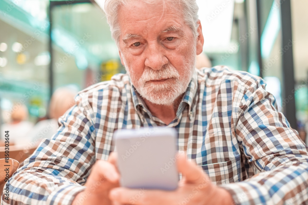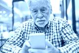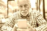 Portrait of a caucasian serious man using mobile phone - handsome bearded elderly man sitting thoughtfully while holding mobile phone