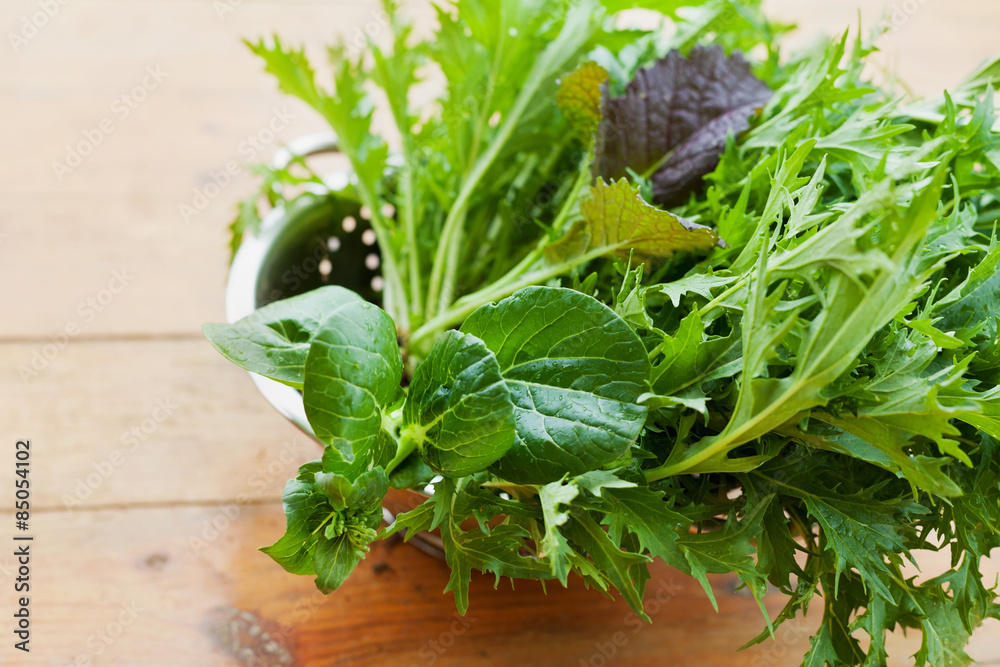 New crop fresh organic mix salad leaves with mizuna, lettuce, pakchoi, tatsoi, kale, spinach and leaf mustard