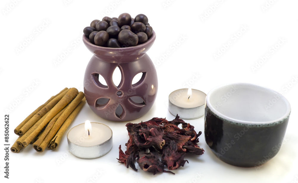 Tea ceremony by candlelight with cinnamon, roses, cup, chocolate isolated on white