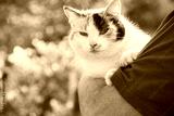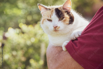 Cat is sitting in the arms of an elderly man and looking at the camera against outdoor nature background.