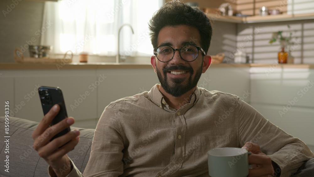 Arabian Indian man ethnic homeowner male joyful happy guy in home kitchen watching online video TV movie on mobile phone reading news drinking morning coffee relaxing on couch looking at camera smile