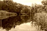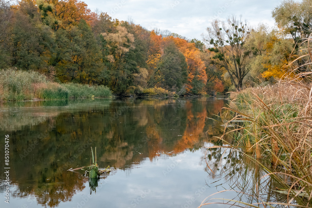 Autumnal scene along the Siverskyi Donets River in Ukraine, with golden trees and serene reflections