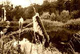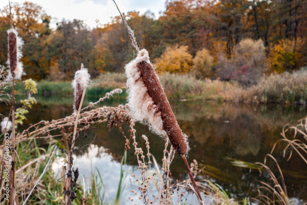 Autumn reeds cattail fluff cotton on colorful autumnal riverside with reflections on water