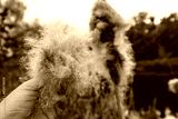 Autumn reeds cattail fluff cotton in hand close-up with riverside moody scenery