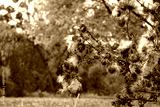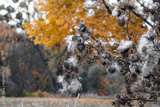 Close-up view of dry prickly flower seed heads with white fluff in colorful yellow scenery