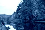 Golden autumn nature river scenery with forest and reeds green grass growing on riverbanks