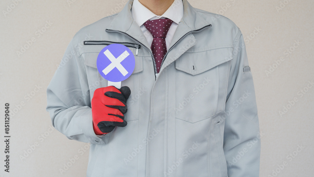 バツ札を持つ作業服の男性|建設業・製造業などのNG・不正解 イメージ