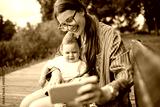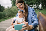On a park bench, a mother and her baby boy enjoy a playful moment with a mobile phone, taking selfies