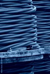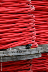 coils Insulated high voltage red electric cable in the warehouse of the power company before laying