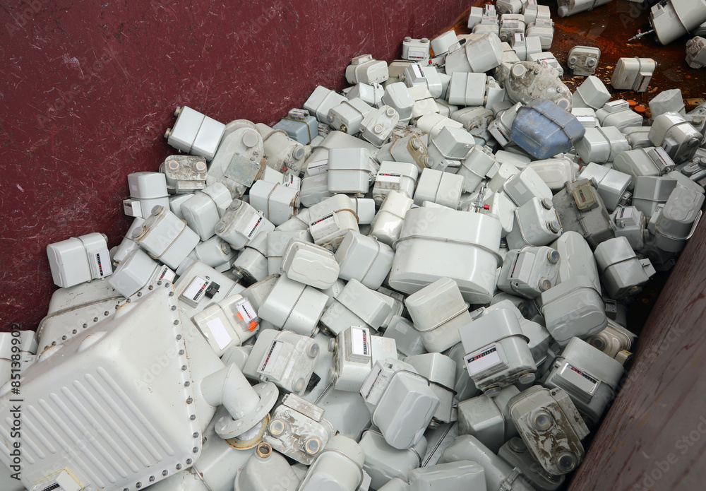 Heaps of used methane gas meters dumped haphazardly and ready for landfill disposal