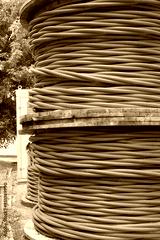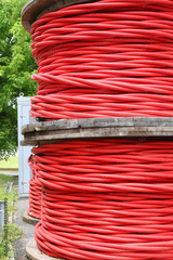 Two spools of high-voltage red electrical cable in the power companys warehouse