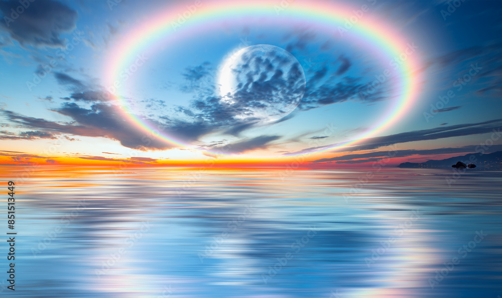 Abstract background of amazing crescent moon over the sea with rainbow at sunset