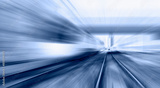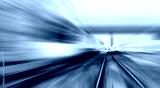 Blue high speed train runs on rail tracks - The train is going too fast as a result the air pressure is causing too much heat at the front