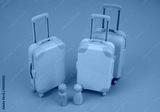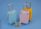 Male and female baggage concept. Female wooden figure with two suitcases and male figure with one suitcase.