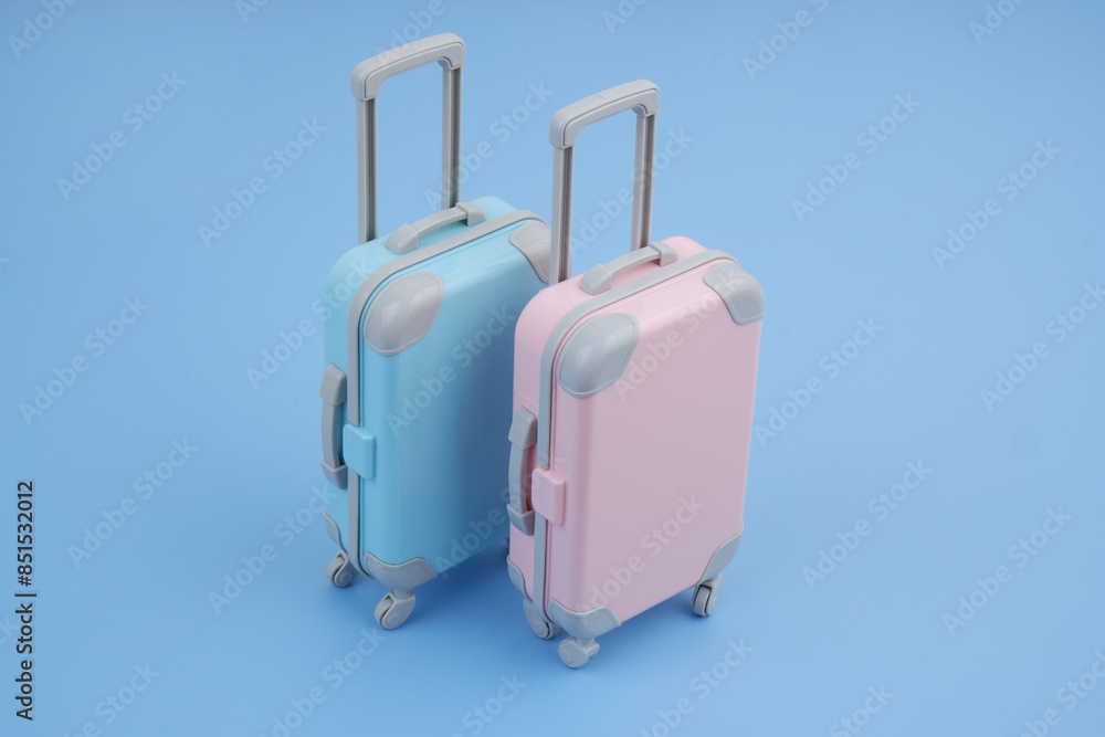 Pink and blue suitcases on blue background. Tourism and travel concept.