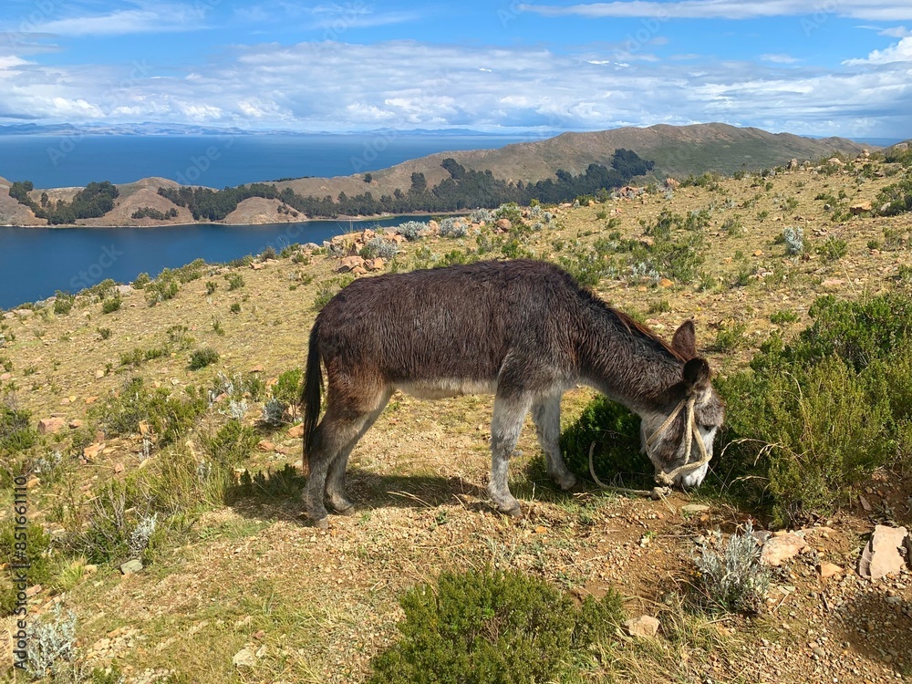 Donkey grazing on pasture in Isla del Sol, Titicaca lake