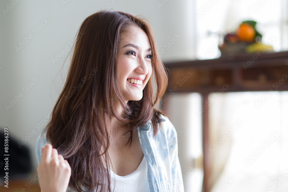 Beautiful asian woman sitting among morning sunshine
