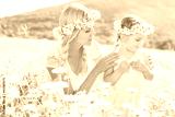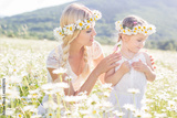 Couple mother and child in field of daisy flowers
