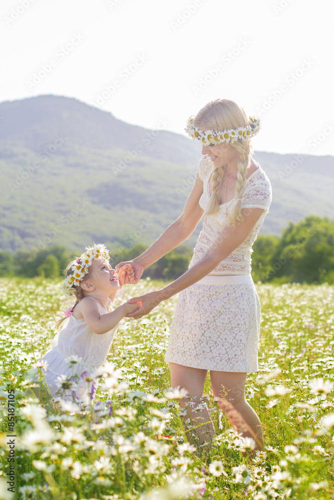 Family mother and child girl in field of daisy flowers