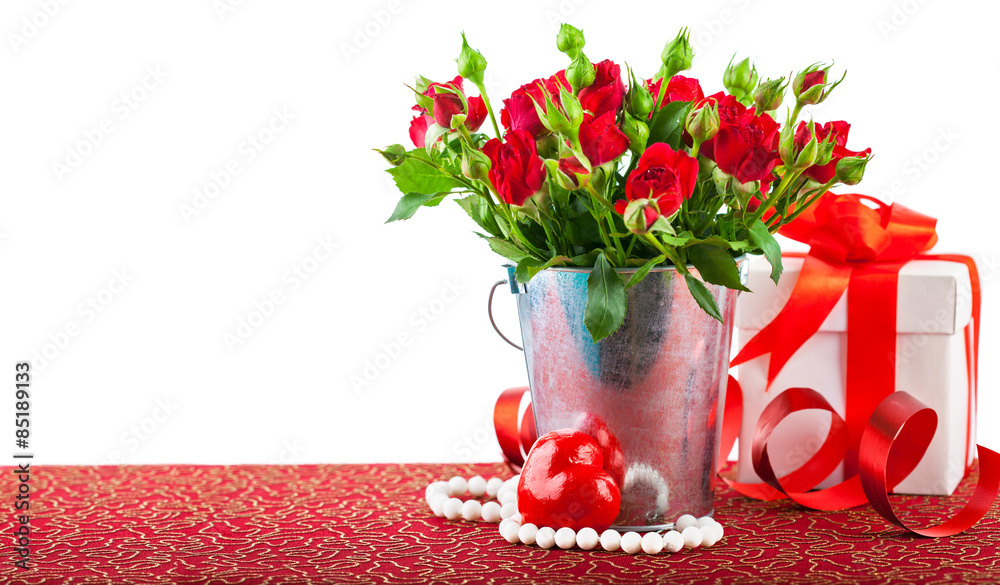 Bunch red roses with gift and heart. Isolated on white