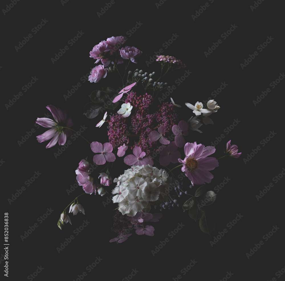 round floral bouquet of pink, purple and white flowers against a dark background, romantic botanical motif or design element for wedding stationery, cards, posters, covers, packaging, branding