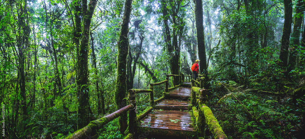 Asian women travel relax Nature Study in the Jungle at Chiangmai in Thailand.