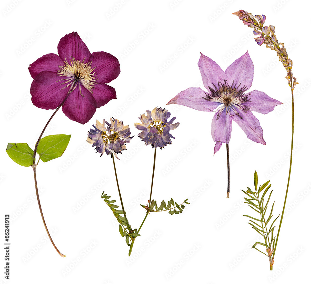 Set of wild dry pressed flowers and leaves