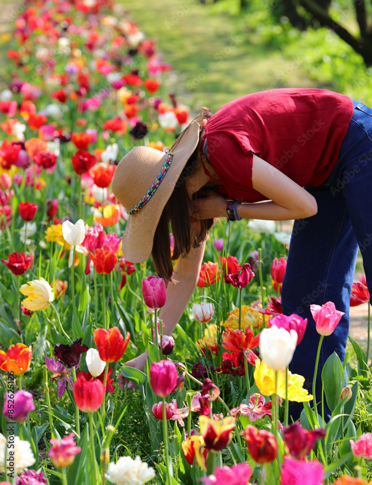 girl in a wide straw hat picking tulips from a blooming flowerbed in spring