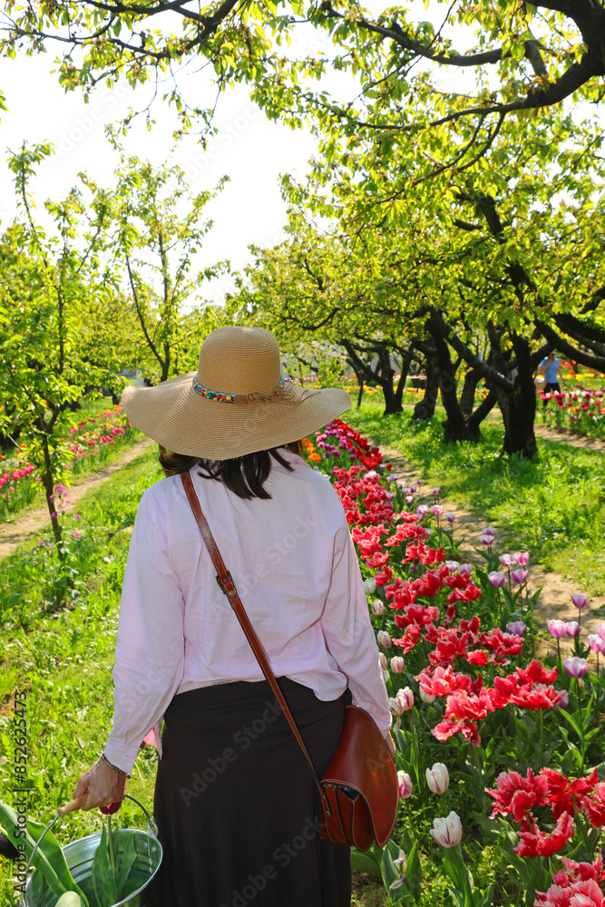 woman with a straw hat and a bucket walks through a field of tulips in spring