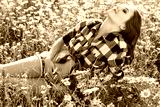 Pregnant smiling woman on field of daisy flowers