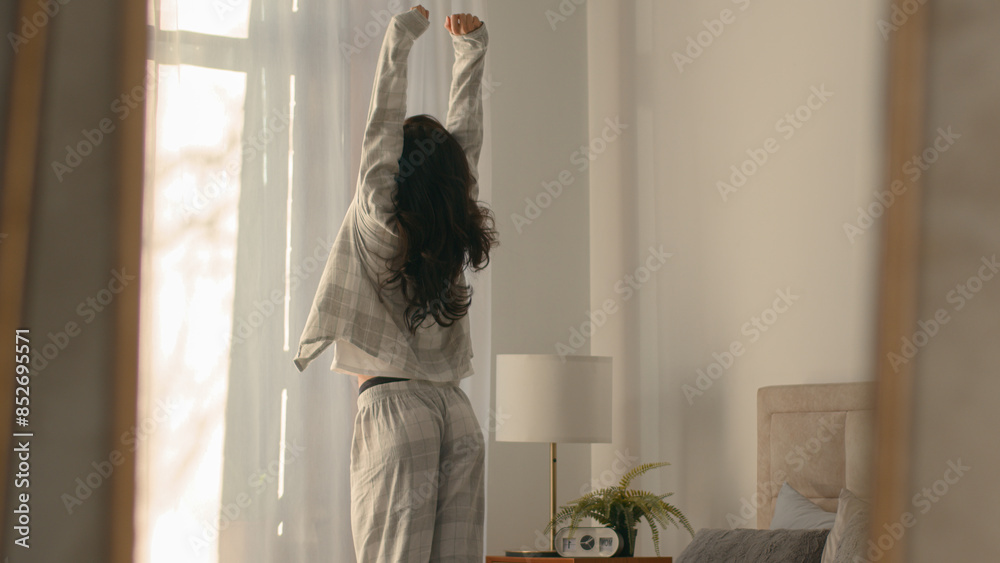 Caucasian woman get out bed awake new sunny day satisfied female stretching looking window good morning bedroom comfortable cozy relax girl hotel energy daylight active refreshing weekend home pulling