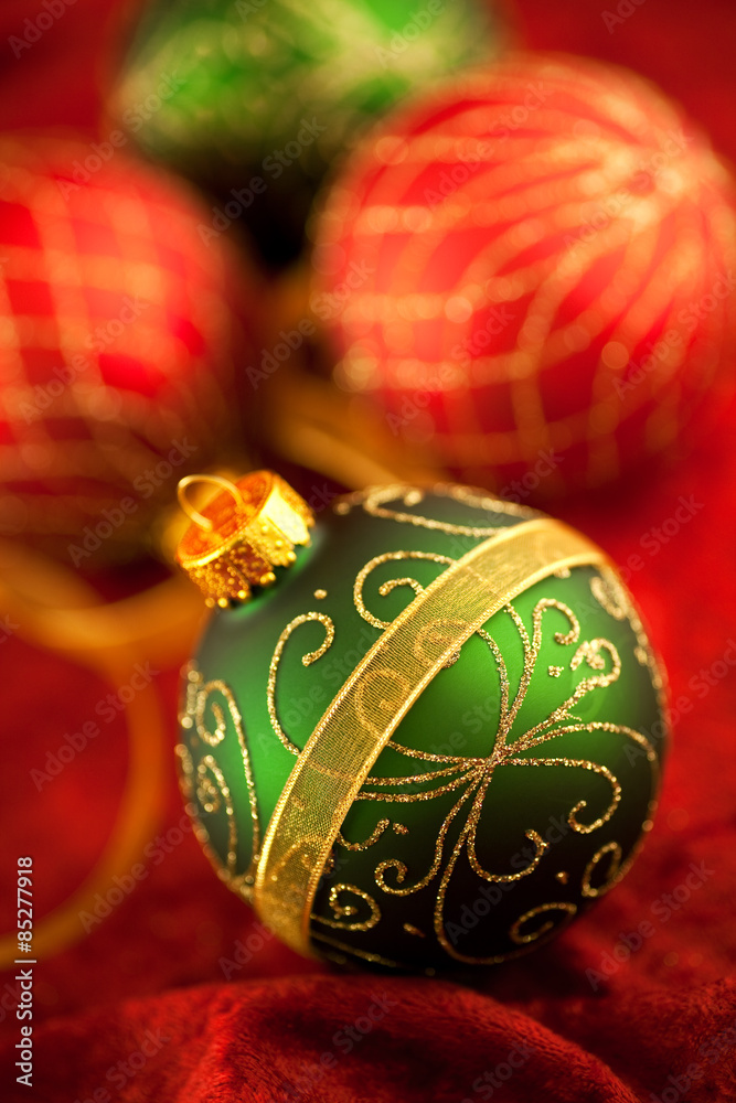 Festive Red and Green Christmas Ornaments with gold detail, ribbon and red velvet background.