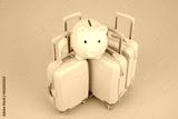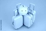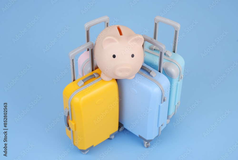 Piggy bank on four suitcases on blue background. Travel trip budget concept.