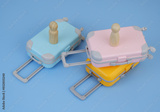 Female and male baggage concept. Male and female people figures on travel suitcases.