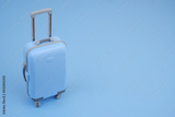 Blue suitcase on blue background. Room for text. Vacation concept.