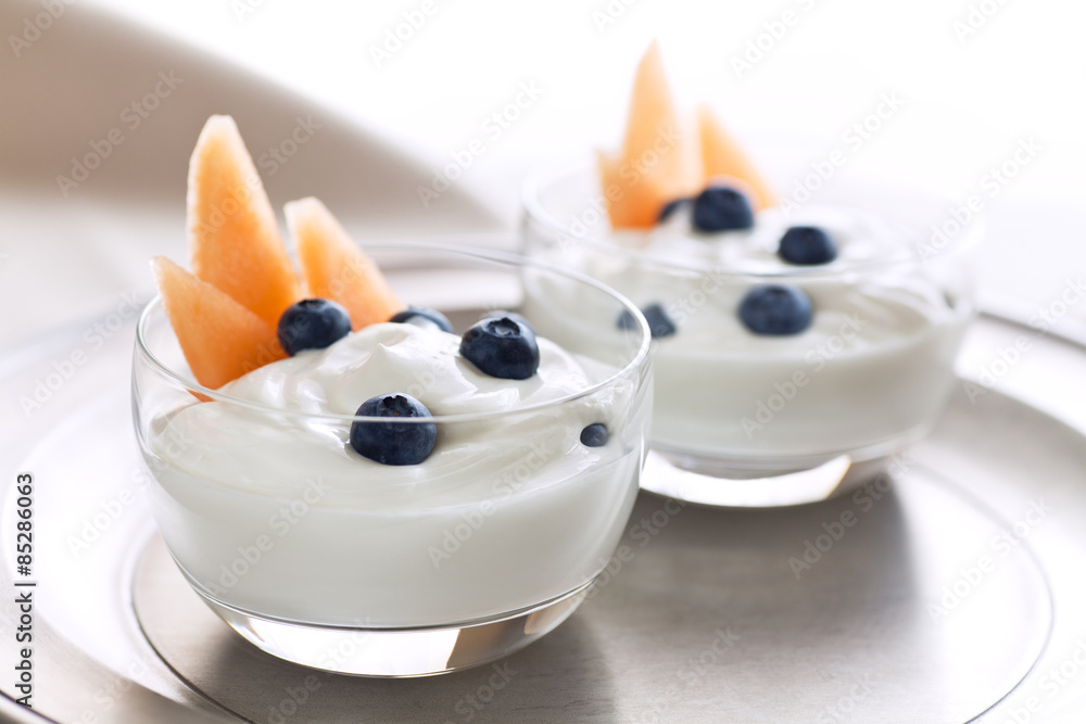 Plain Greek Yogurt & Fruit in two bowls in natural daylight setting.