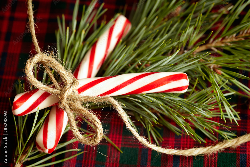 Holiday Candy Cane sticks tied with a twine bow and fresh evergreen branch on plaid background. Horizontal orientation.
