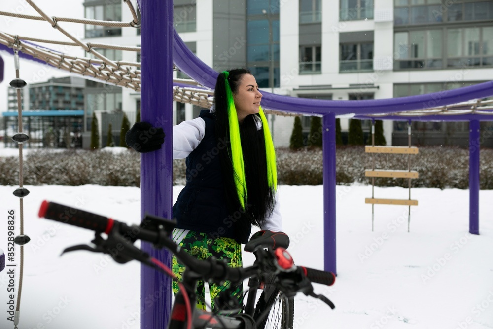 Woman Standing Next to Bike in Snow