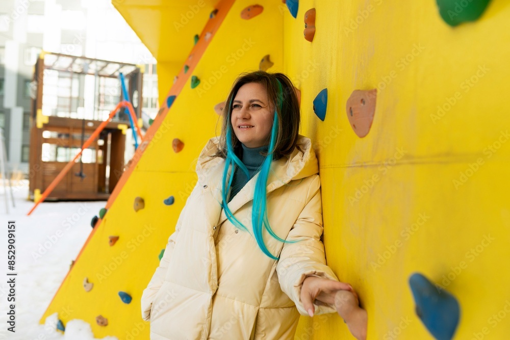 Woman Standing Next to Yellow Climbing Wall